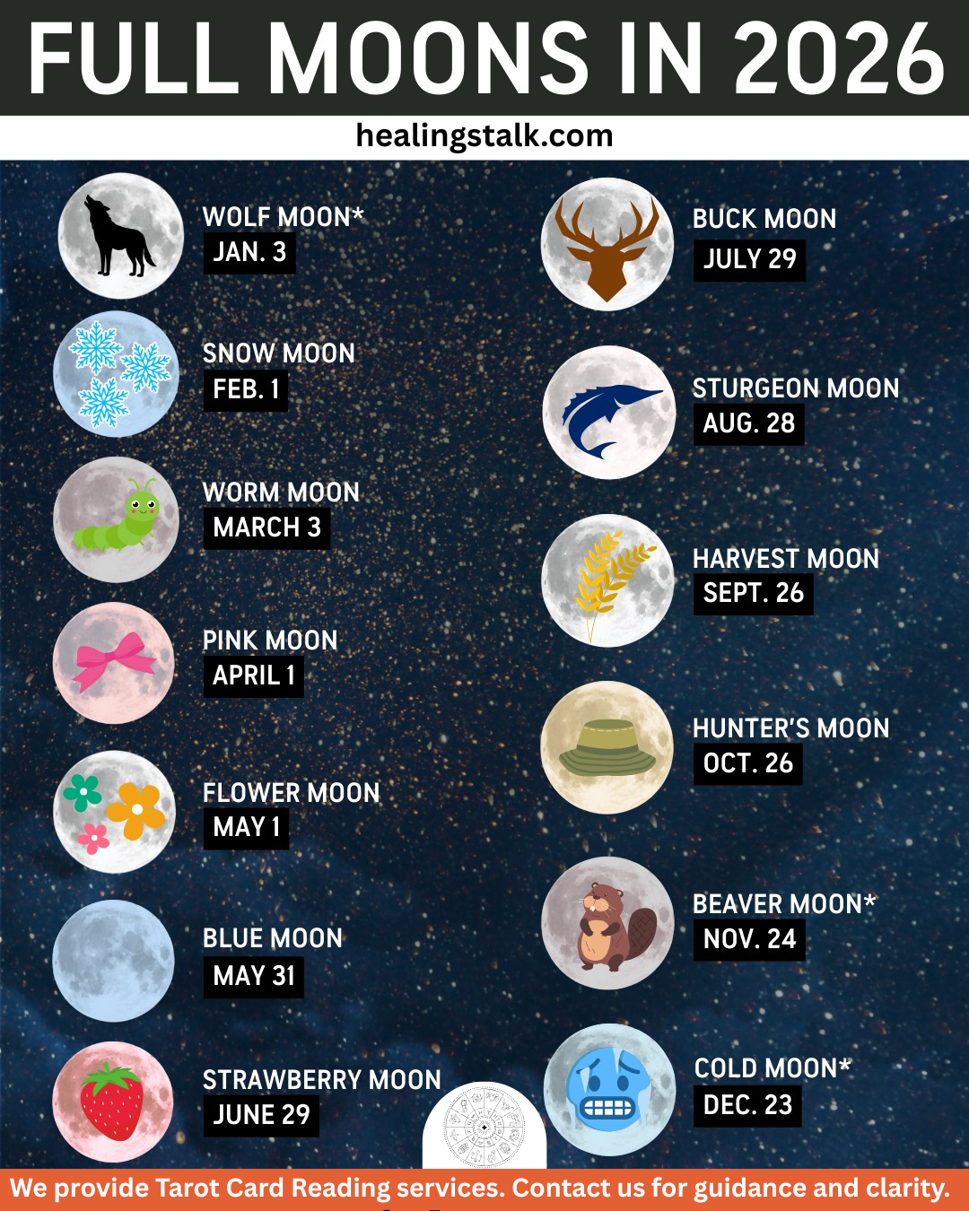 A full moon is a natural event that brings many opportunities to heal your soul, body, and mind. Full moon January 2026, Wolf Moon is a supermoon also, so you can see it brighter and bigger on 3 January 2026. You can use this full moon to energize your crystals, to make moon water, meditation, and affirmations. To get more information about the full moon, connect with me on my web page.